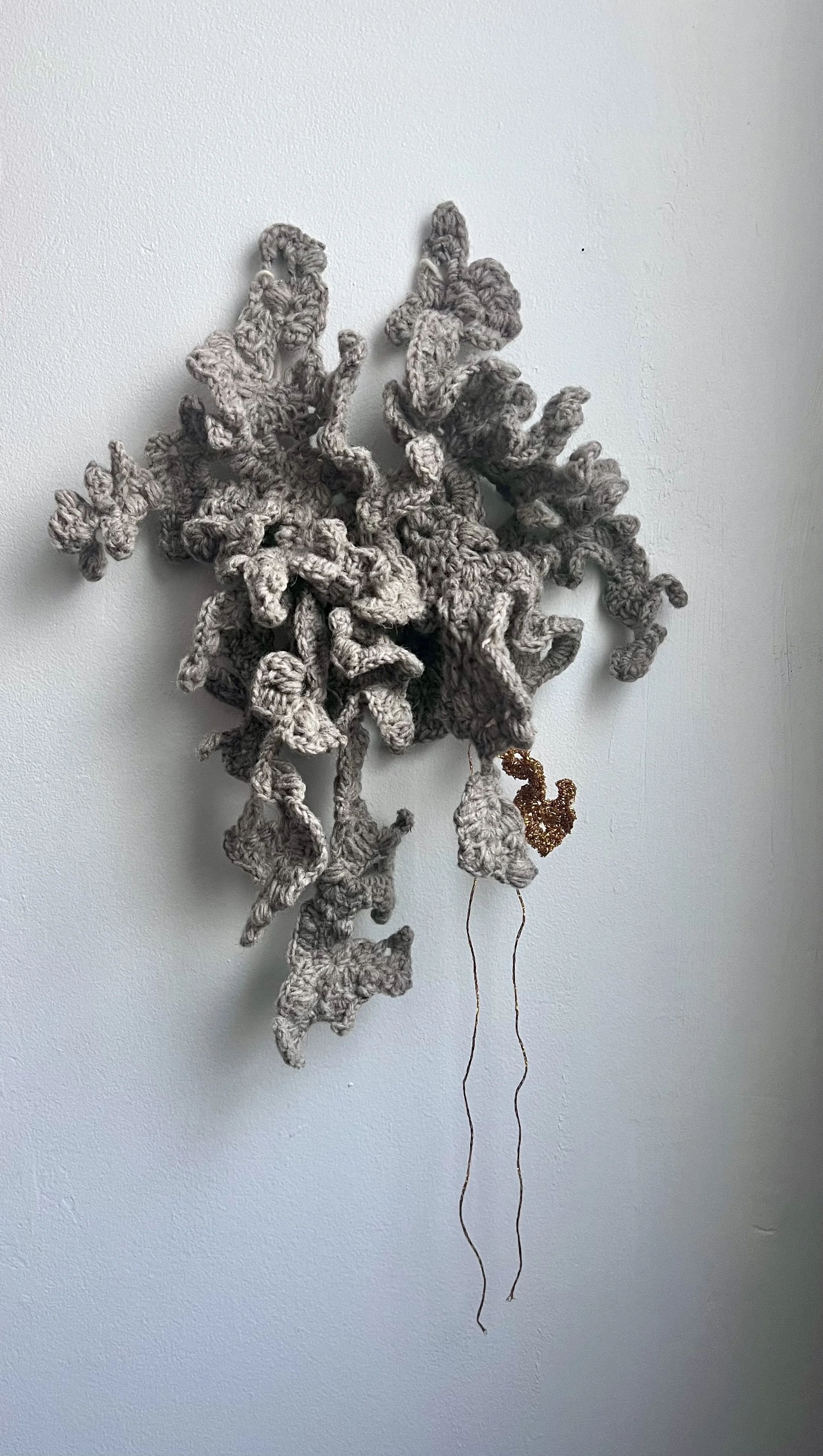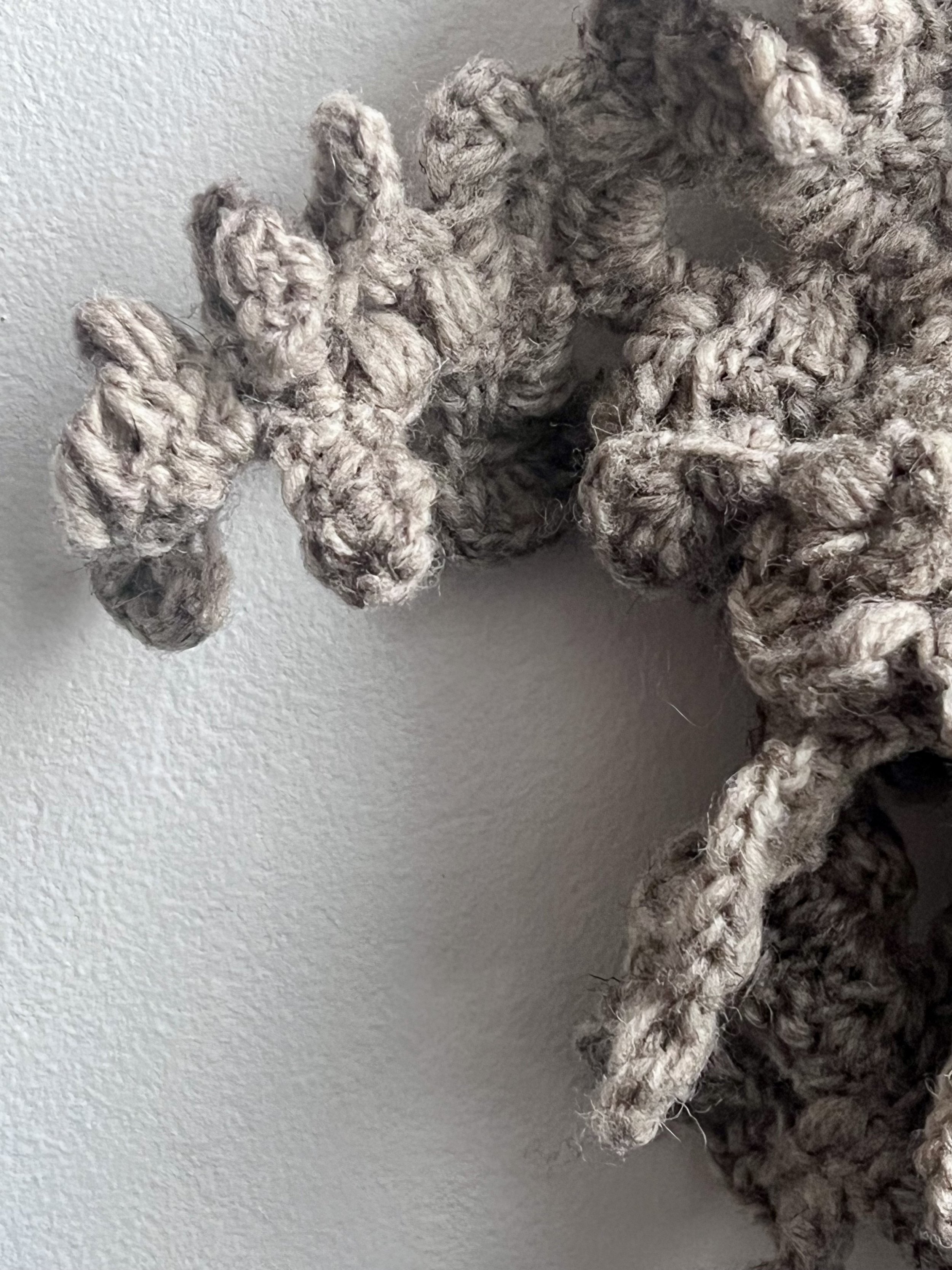 Ma démarche avec cette série, repose aussi sur le passage à une forme de tridimensionnalité. Le tissu crocheté, de manière intuitive et non-linéaire, génère des excroissances sculpturales qui s’approprient l’espace, rappelant des structures biologiques ou minérales qui suivent une direction. Il s'agit d'une exploration de la forme "autogénérée" où le geste suit la résistance et la plasticité de la fibre.