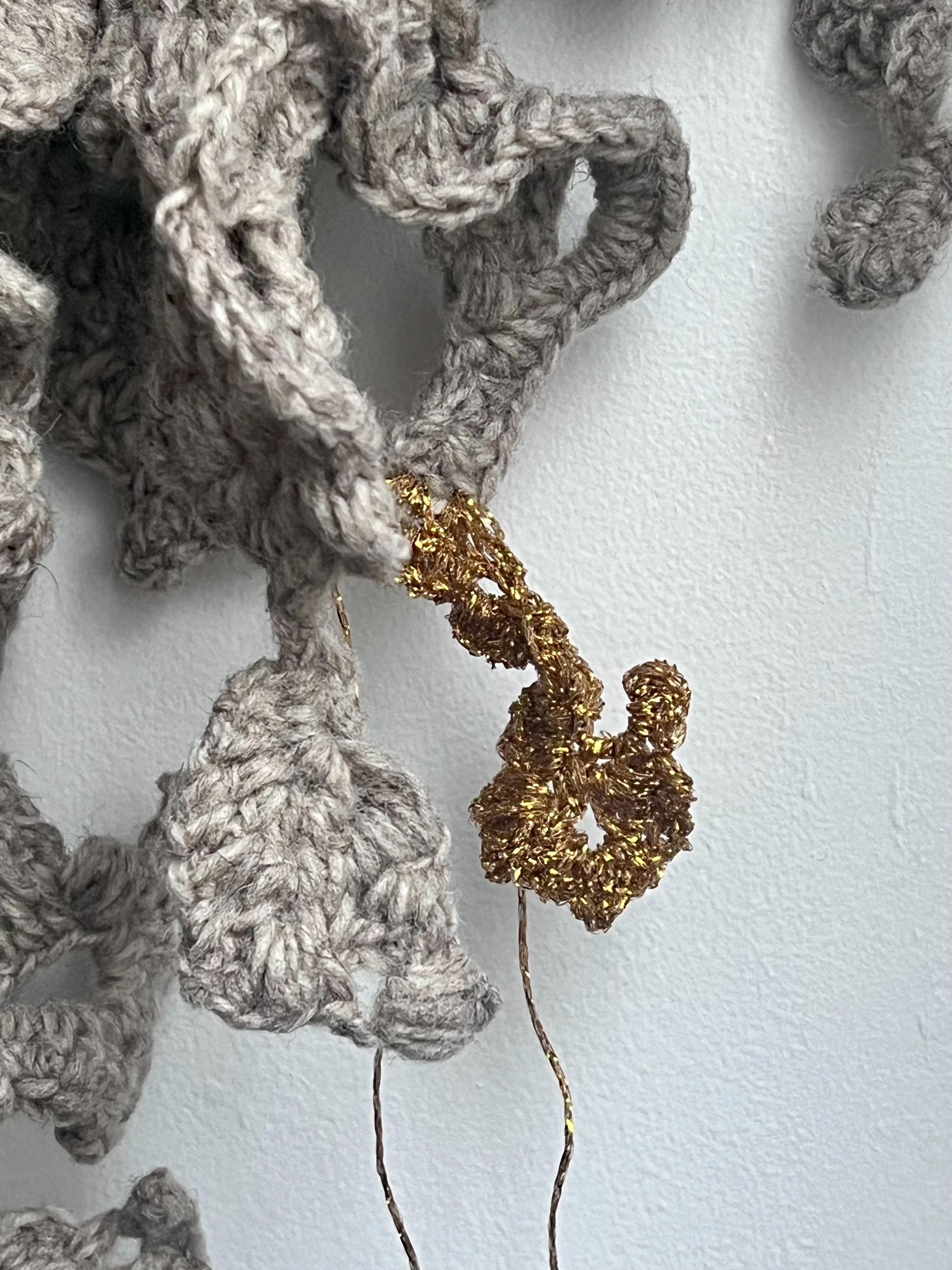 L’insertion du fil métallique au sein de cette masse de laine provoque un surgissement de lumière, invitant à une forme de rêverie, un état de conscience active, proche de ce que peut permettre l'imagination active décrite par Carl Jung, ici la main et l'esprit collaborent. Ce contraste de matériaux symbolise la métamorphose que tout être expérimente dans son temps passé sur Terre et les liens qu’il y tisse. Je cherche à explorer le concept de la "materia prima" des alchimistes qui, ici, sous l'action du geste répété, révèle sa luminosité cachée. En utilisant la laine comme réceptacle et le crochet comme l’outil révélateur de lumière, mon travail interroge la frontière entre l'humble et le sacré, et tend à donner au travail manuel une portée archétypale : celle d'extraire une forme de beauté des profondeurs.